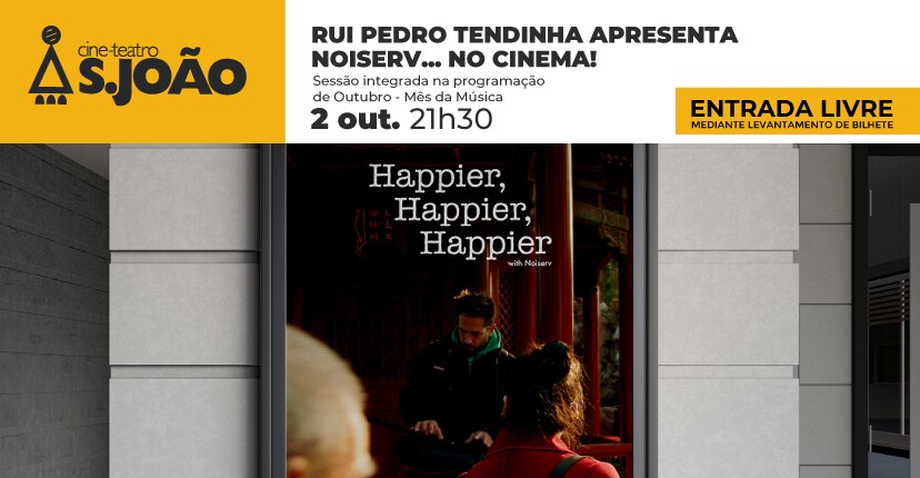 O artista Noiserv vai estar em Palmela no dia 2 de outubro, a participar na sessão “Rui Pedro Tendinha Apresenta Noiserv... no Cinema!”, às 21h30, no Cine-Teatro S. João. Durante a iniciativa, vai ser exibida a curta-metragem “Happier, Happier, Happier”, realizada por Telmo Soares, seguida de conversa.