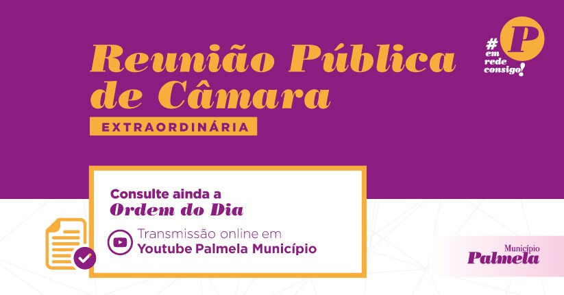 A Câmara Municipal de Palmela reúne em sessão pública extraordinária no dia 22 de dezembro, às 15h00, no Auditório da Biblioteca Municipal de Palmela, com a seguinte ordem de trabalhos: