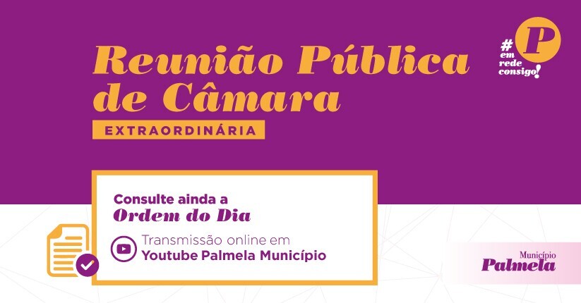 A Câmara Municipal de Palmela reúne em sessão pública extraordinária no dia 26 de novembro, às 15h00, no Auditório da Biblioteca Municipal de Palmela, com a seguinte ordem de trabalhos: