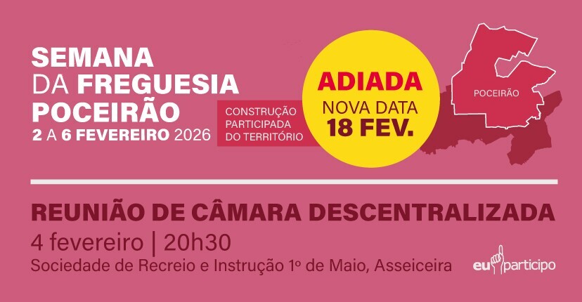 A Câmara Municipal de Palmela realiza uma reunião pública descentralizada no dia 4 de fevereiro, às 20h30, na Sociedade de Recreio e Instrução 1.º de Maio, Asseiceira, no âmbito da Semana da Freguesia de Poceirão. A ordem de trabalhos é a seguinte: