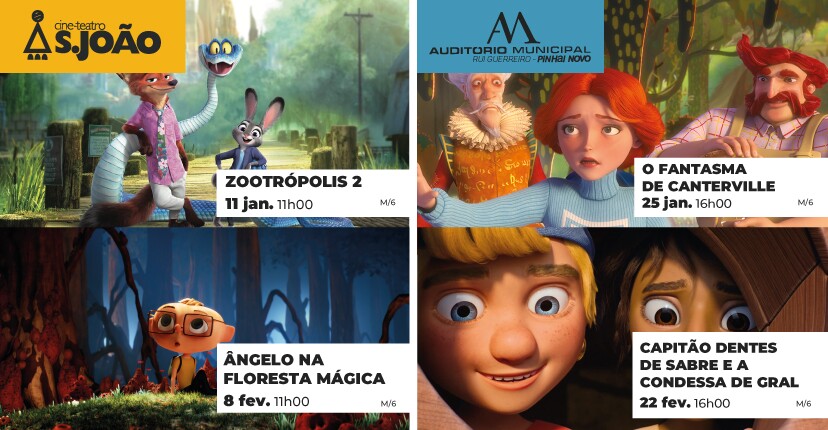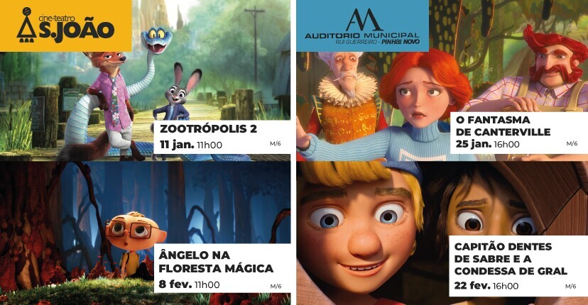 Os filmes “Zootrópolis 2” e “Ângelo na Floresta Mágica” são as propostas de Cinema Infantil que vão ser exibidas no Cine-Teatro S. João, em Palmela, a 11 de janeiro e 8 de fevereiro, respetivamente. O Auditório Municipal de Pinhal Novo - Rui Guerreiro apresenta “O Fantasma de Canterville” (25 janeiro) e “Capitão de Dentes de Sabre e a Condessa de Gral” (22 fevereiro).