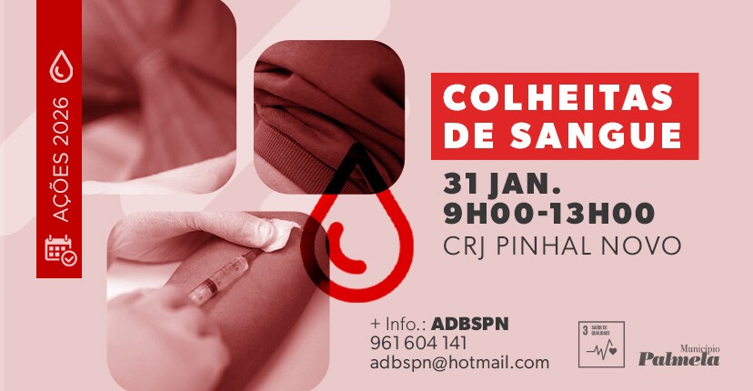 No dia 31 de janeiro, seja solidária/o e participe na colheita de sangue que vai decorrer no Centro de Recursos para a Juventude (CRJ) de Pinhal Novo, entre as 9h00 e as 13h00.