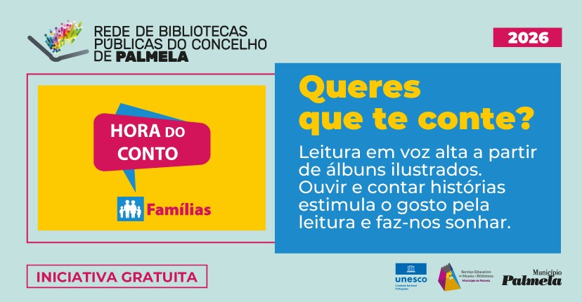 O projeto “Hora do Conto Famílias” prossegue, em 2026, com a dinamização do “Queres que te conte?” nas Bibliotecas Municipais de Palmela (10 janeiro e 14 fevereiro) e Pinhal Novo (17 janeiro e 21 fevereiro) e no Polo da Marateca, em Águas de Moura (24 janeiro e 28 fevereiro).