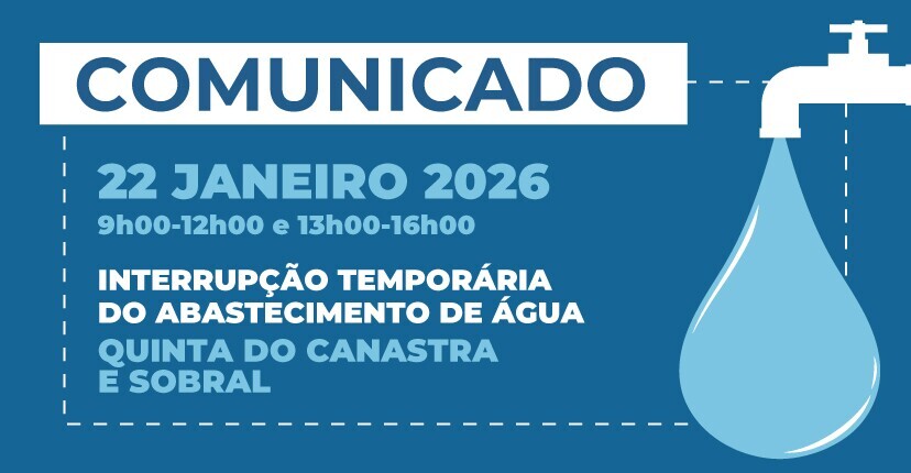 O abastecimento de água será temporariamente interrompido no dia 22 de janeiro, previsivelmente, das 9h00 às 12h00 e das 13h00 às 16h00, na Quinta do Canastra e Sobral, freguesia de Pinhal Novo.