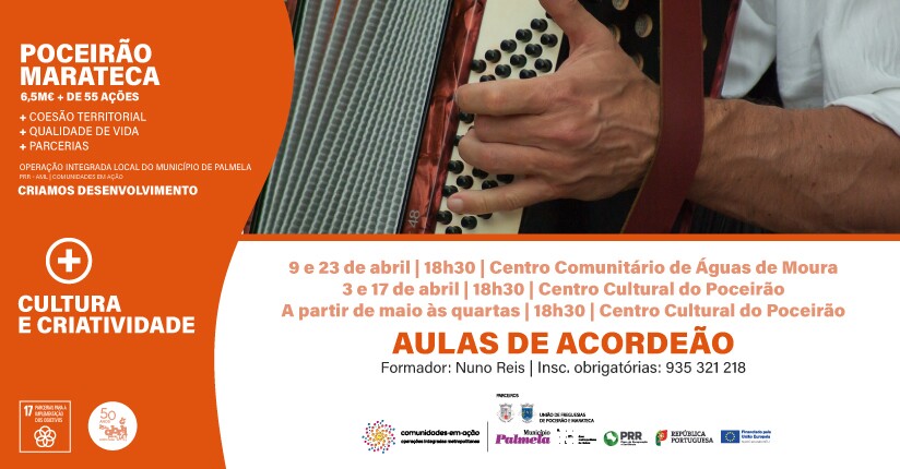 Já tiveram início as ações de divulgação do Projeto de Acordeão, com aulas abertas, no Centro Cultural de Poceirão (CCP) e no Centro Comunitário de Águas de Moura (CCAM), com o Formador Nuno Reis e participação gratuita.