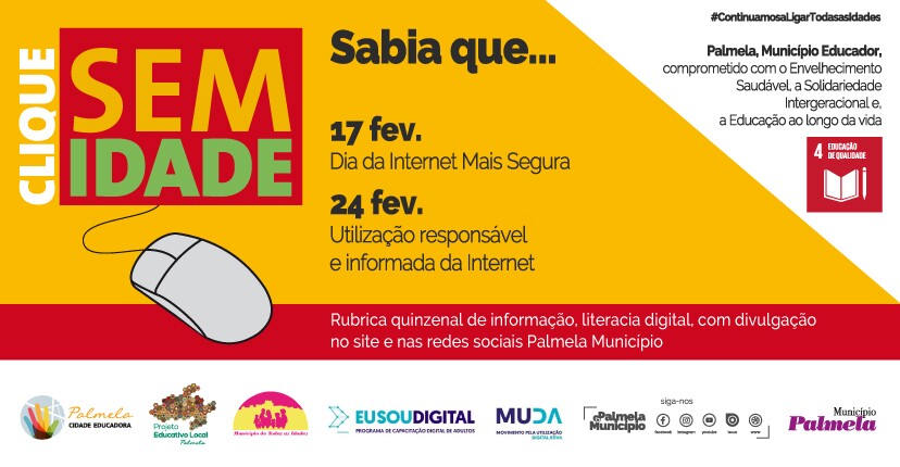 “Palmela, Município Educador”, comprometido com o Envelhecimento Saudável, a Solidariedade Intergeracional e a Educação ao longo da vida, desafia as diferentes gerações a uma utilização digital mais ativa, informada e responsável, associando-se uma vez mais, às comemorações do Dia da Internet Mais Segura, assinalado a 8 de fevereiro.