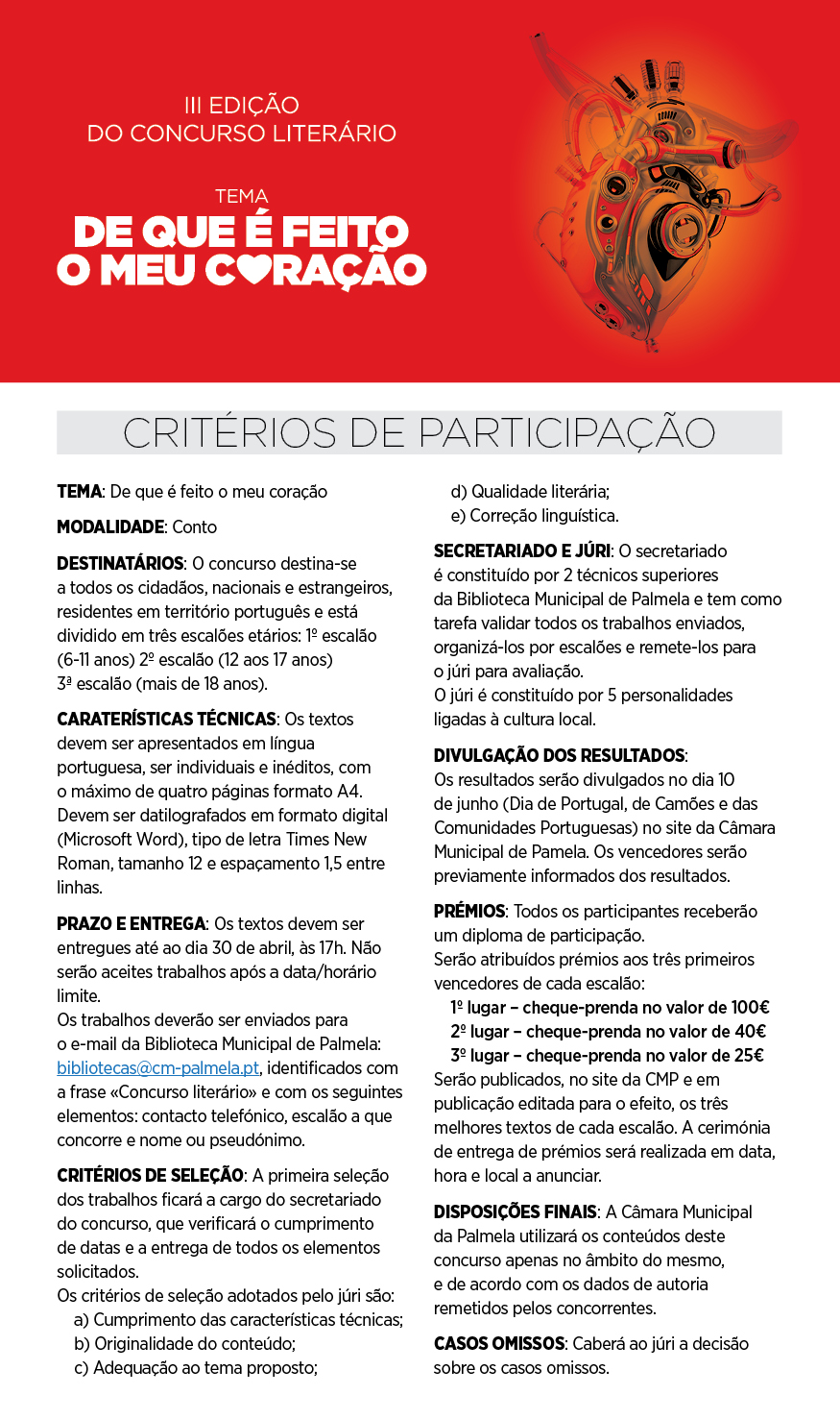 Este ano, com o mote “De que é feito o meu coração” o concurso tem como objetivos promover e valorizar a escrita, a leitura e o livro, e dar oportunidade às/aos escritoras/es de mostrarem o seu trabalho.