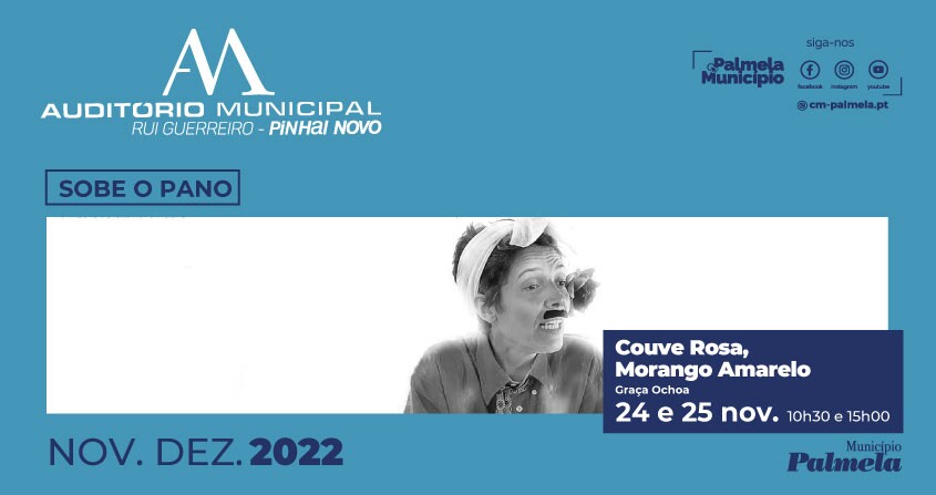 O Auditório Municipal de Pinhal Novo - Rui Guerreiro recebe o espetáculo “Couve Rosa, Morango Amarelo”, de Graça Ochoa, a 24 e 25 novembro, às 10h30 e às 15h00, destinado à comunidade educativa (2.º Ciclo do Ensino Básico).