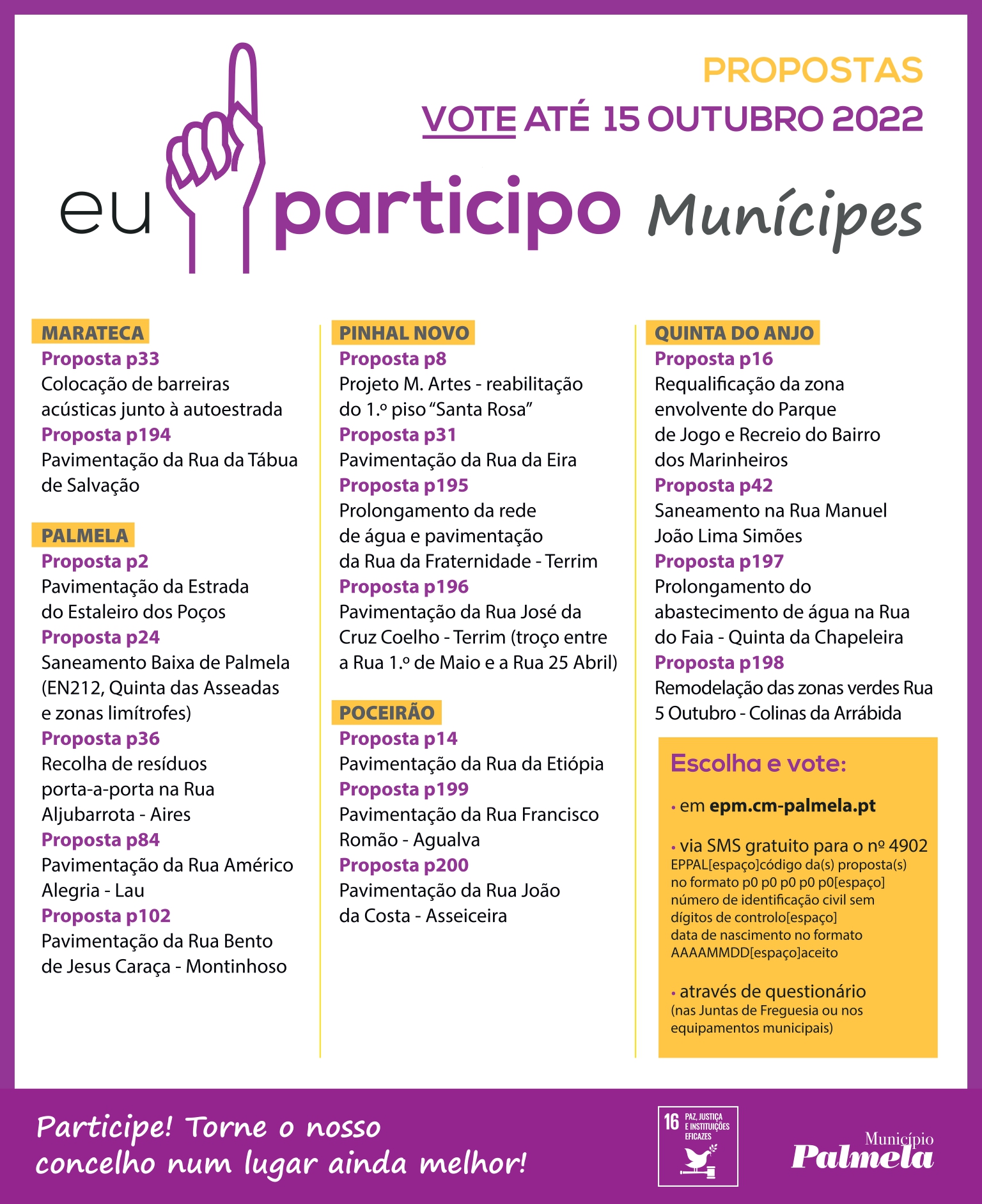 Consulte aqui, ou na plataforma online - https://epm.cm-palmela.pt a lista das obras e vote até 15 de outubro. É necessário, para este efeito, estar devidamente registada/o na plataforma. A votação poderá, também, ser efetuada em formato papel, mediante preenchimento de documento próprio, disponível nas Juntas de Freguesia do concelho e edifícios municipais ou através de SMS gratuito, para o número 4902, da seguinte forma: EPPAL[espaço]código da(s) proposta(s) no formato p0 p0 p0 p0 p0[espaço]número de identificação civil sem dígitos de controlo[espaço]data de nascimento no formato AAAAMMDD[espaço]aceito.
