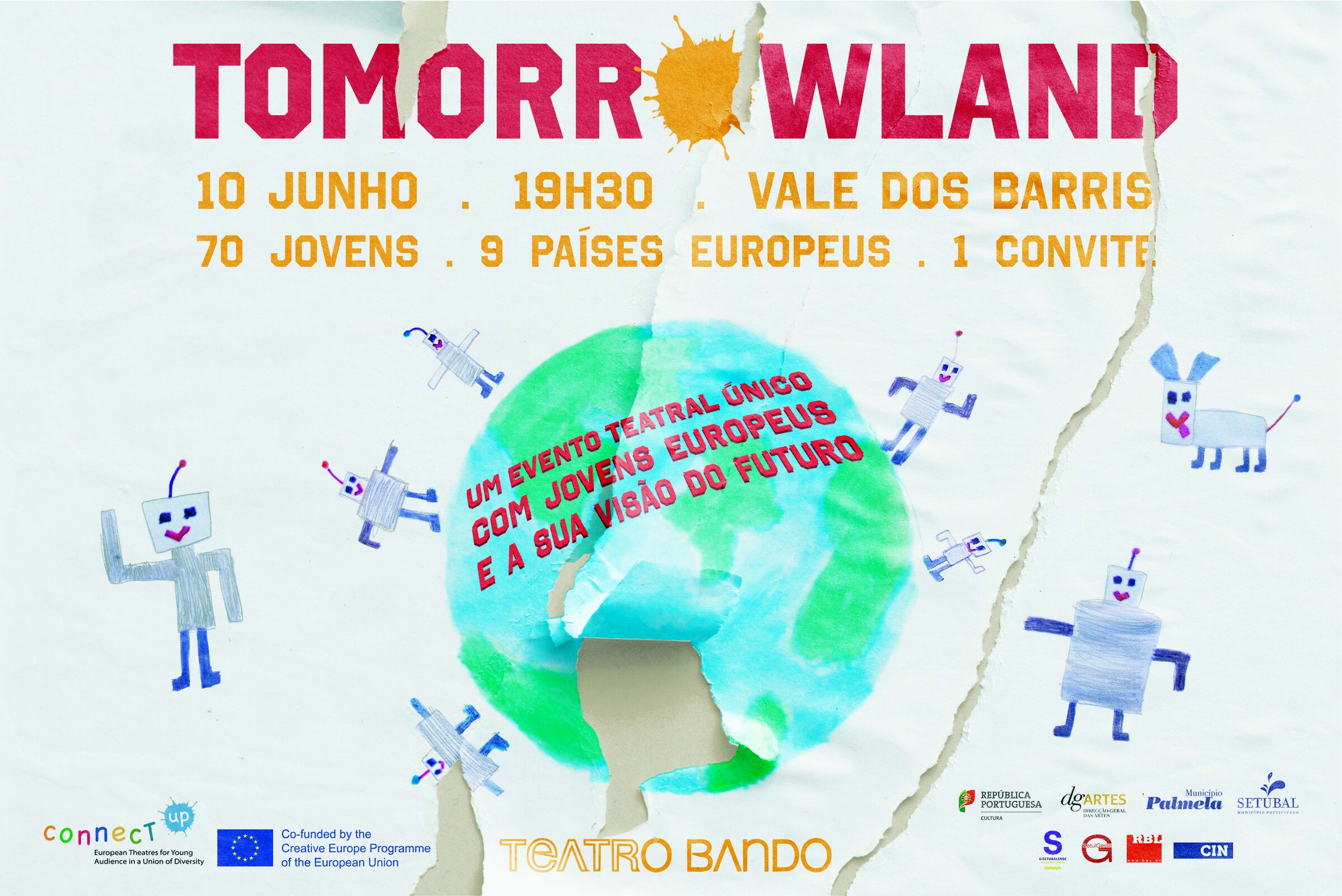 Cerca de 70 jovens de nove países europeus participam no Encontro de Jovens “Tomorrowland”, que decorre de 3 a 11 de junho, no Teatro O Bando, em Vale dos Barris (Palmela). Este evento teatral único, com jovens europeus e a sua visão do futuro, é organizado Pelo Teatro O Bando em conjunto com a rede europeia ConnectUp e conta com o apoio da Câmara Municipal de Palmela.
