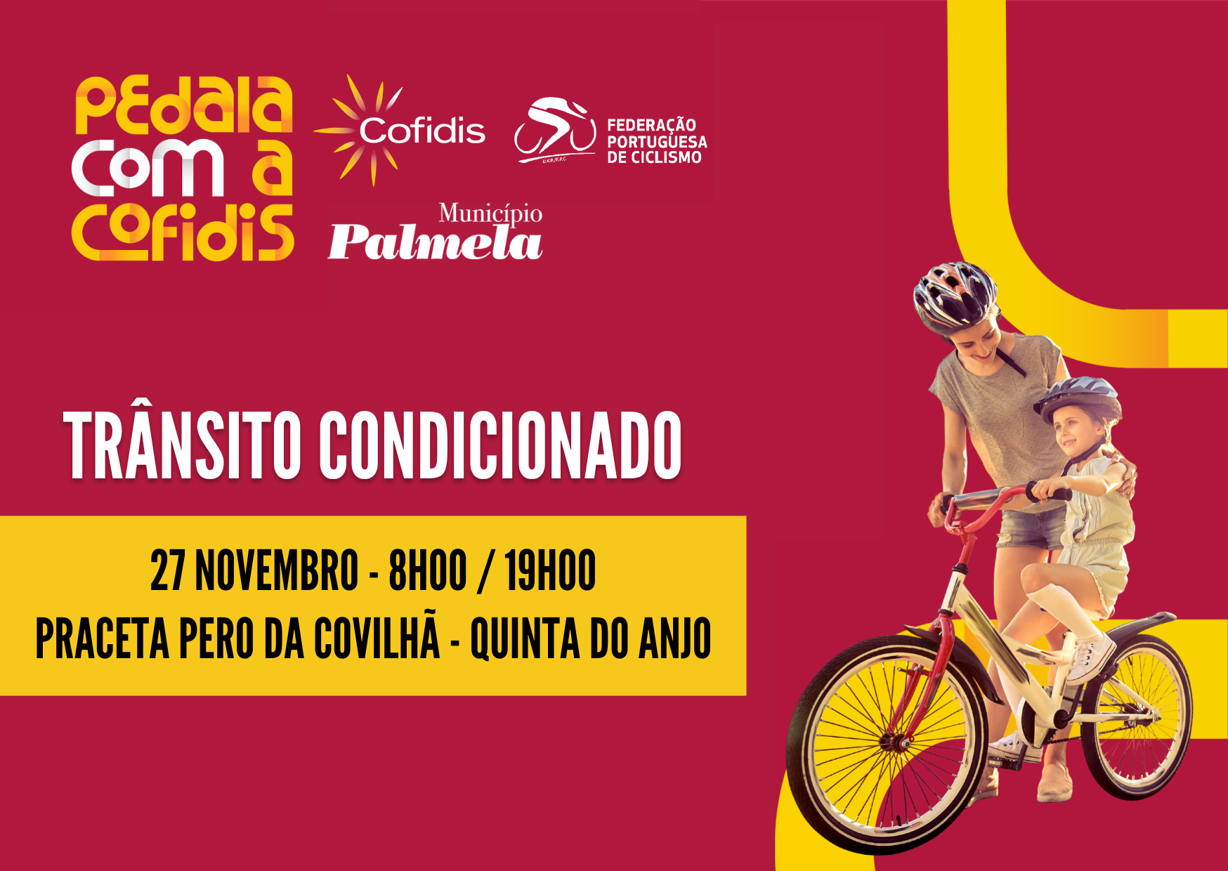 Devido à realização do evento desportivo “Pedala com a Cofidis”, no dia 27 de novembro, o estacionamento de veículos será proibido e a circulação automóvel estará cortada e condicionada, entre as 8h00 e as 19h00, na Praceta Pero da Covilhã, na Urbanização Portais da Arrábida, em Quinta do Anjo.