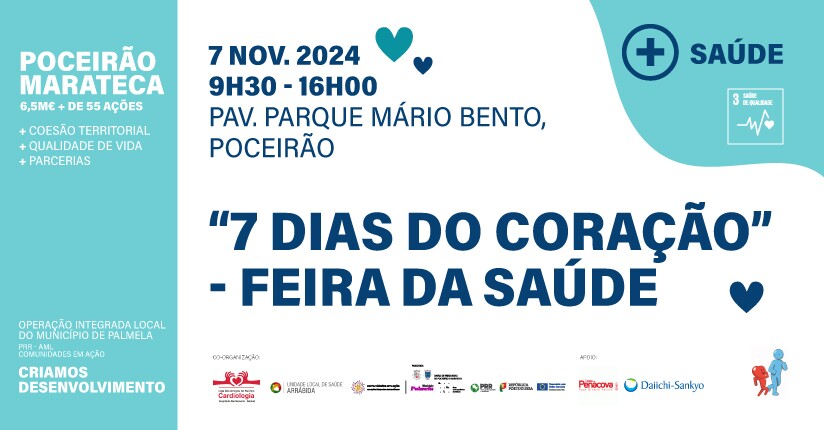 “7 Dias do Coração” – Feira da Saúde é uma iniciativa coorganizada pela Liga dos Amigos do Serviço de Cardiologia do Centro Hospitalar de Setúbal, EPE, Unidade Local de Saúde da Arrábida (ULS Arrábida) e Município de Palmela, com o apoio da União de Freguesias de Poceirão e Marateca.