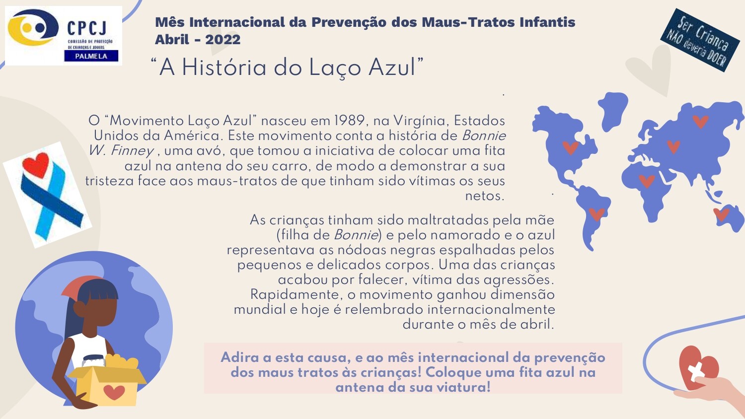 O “Movimento Laço Azul” nasceu em 1989, nos Estados Unidos da América, a partir da história de Bonnie W. Finney, uma avó que tomou a iniciativa de colocar uma fita azul na antena do carro, de modo a demonstrar a sua tristeza face aos maus–tratos de que tinham sido vítimas os seus netos. Rapidamente, o movimento ganhou dimensão mundial e é relembrado internacionalmente, durante este mês.