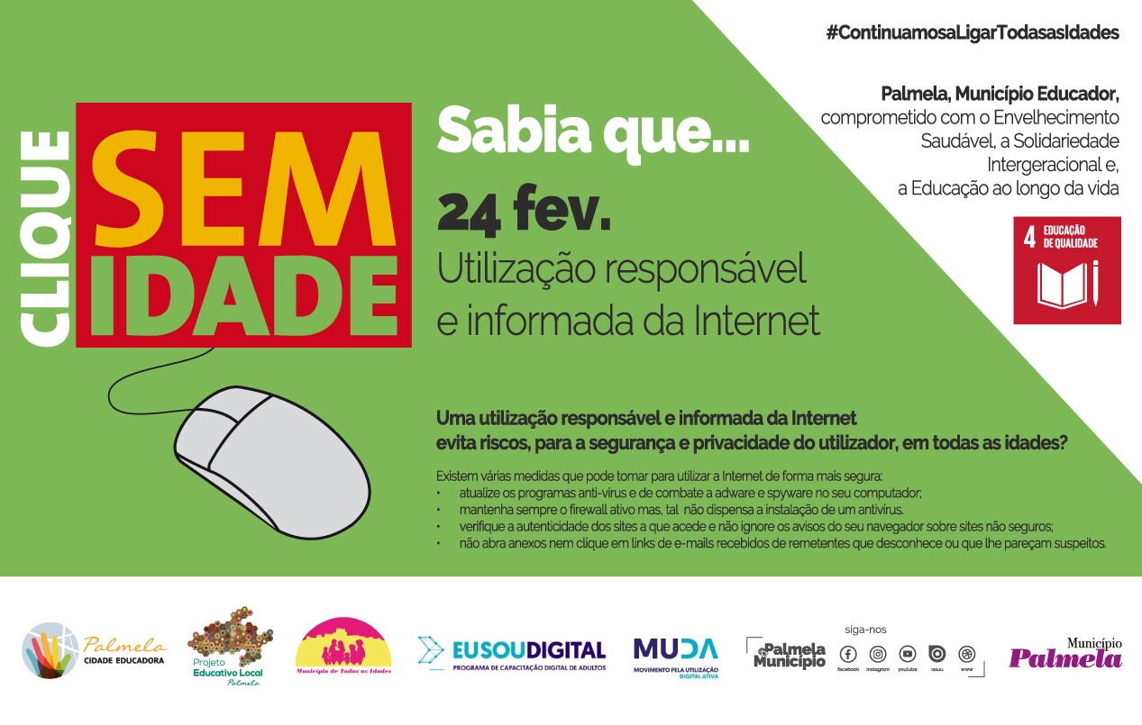 “Palmela, Município Educador”, comprometido com o Envelhecimento Saudável, a Solidariedade Intergeracional e a Educação ao longo da vida, desafia as diferentes gerações a uma utilização digital mais ativa, informada e responsável. A utilização da internet traz enormes benefícios, mas também, alguns riscos, para a segurança e privacidade da utilizadora/or.