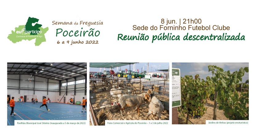 A Câmara Municipal de Palmela reúne em sessão pública descentralizada, no âmbito da Semana da Freguesia do Poceirão, dia 8 de junho, quarta-feira, às 21h00, na sede do Forninho Futebol Clube, com a seguinte ordem de trabalhos:
