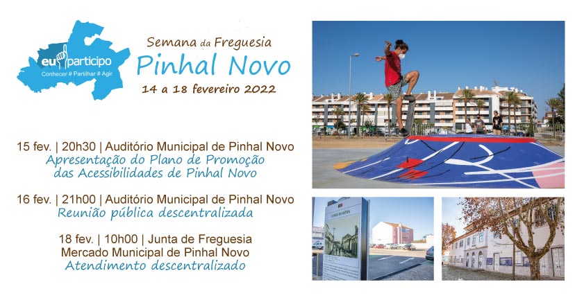 Do programa, destaca-se a apresentação do Plano de Promoção das Acessibilidades de Pinhal Novo, dia 15, às 20h30, no Auditório Municipal de Pinhal Novo; a Reunião Pública de Câmara descentralizada, dia 16, às 21h00, no Auditório Municipal de Pinhal Novo e o atendimento descentralizado pelas/os eleitas/os (marcação prévia até às 10h00 de 17, sexta-feira – 212336650).