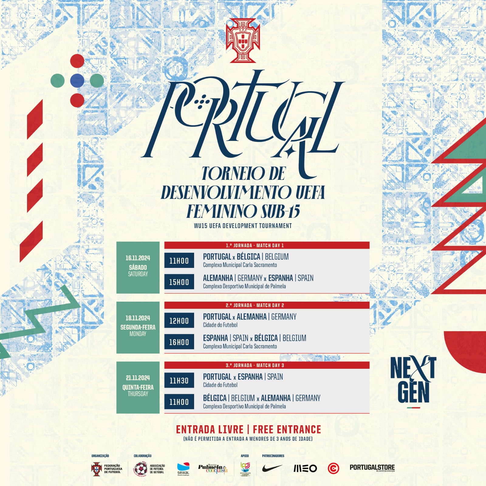 No evento, com entrada livre, promovido pela Federação Portuguesa de Futebol, em colaboração com a Associação de Futebol de Setúbal e os Municípios de Palmela e Seixal, poderá acompanhar, o jogo da 1.ª jornada entre as seleções da Alemanha e da Espanha, no dia 16, às 15h00 e o jogo da 3.º jornada entre as seleções da Bélgica e da Alemanha, no dia 21, às 11h00.