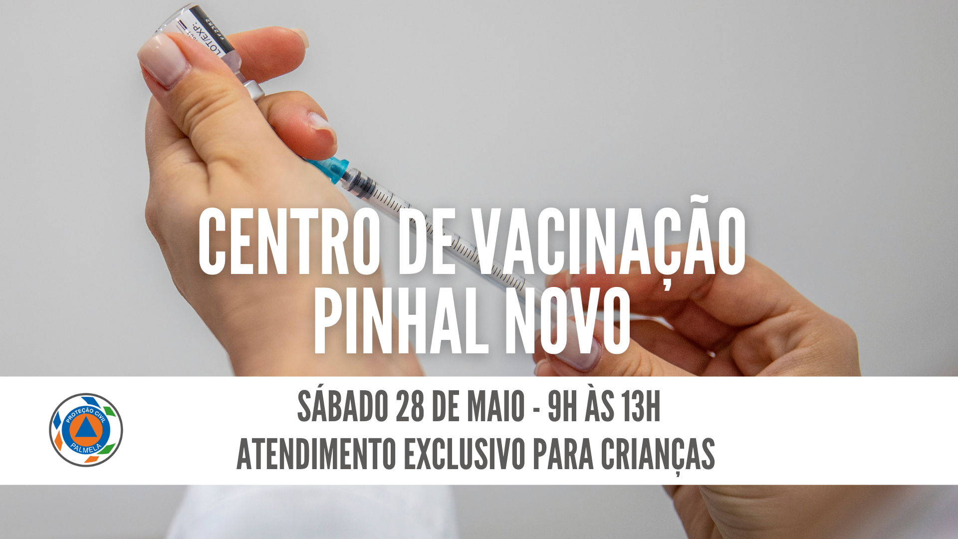 O Centro Municipal de Vacinação em Pinhal Novo funcionará, excecionalmente, no dia 28 de maio, sábado, para vacinação exclusiva de crianças (COVID-19). Para este efeito, as/os utentes deverão dirigir-se ao Centro de Vacinação entre as 9h00 e as 13h00.