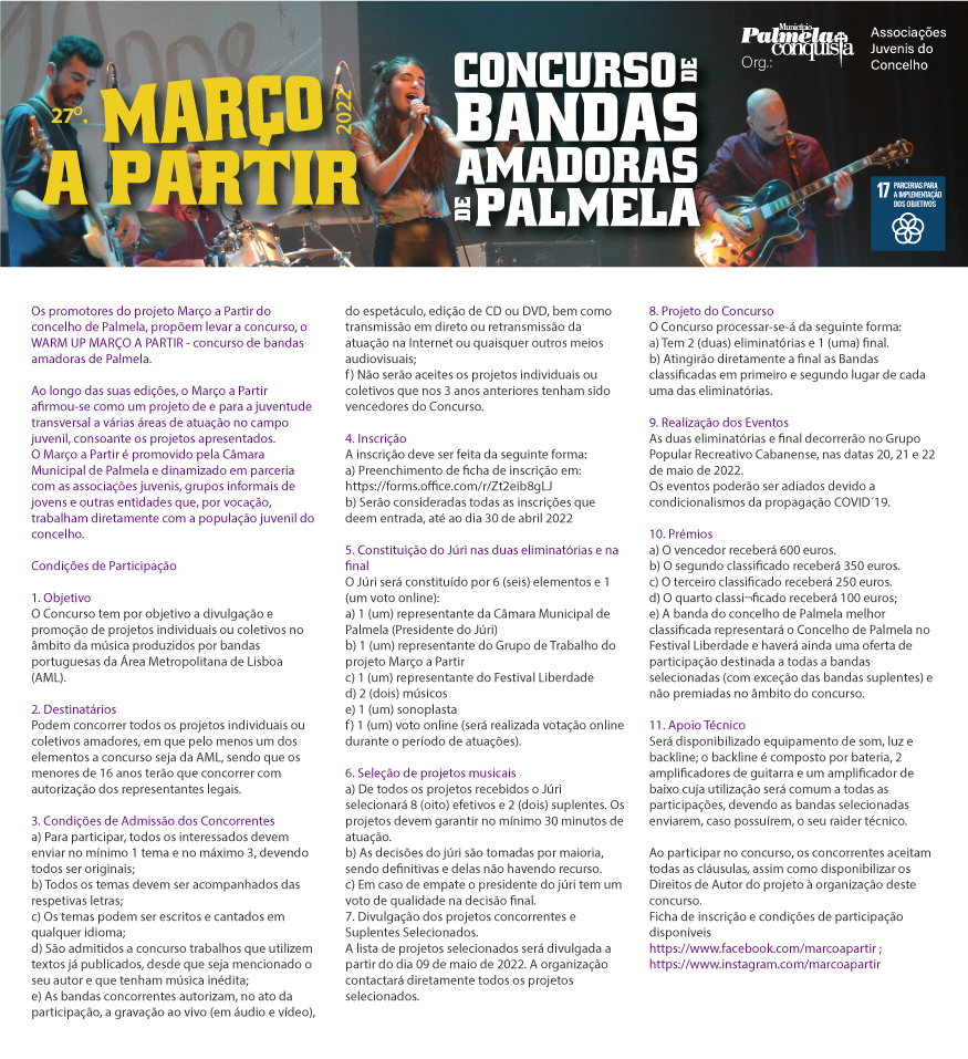 As inscrições para o Concurso de Bandas Amadoras de Palmela Warm Up “Março a Partir” encerram a 30 de abril.